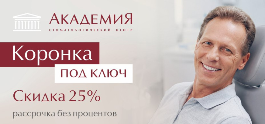 С 3 декабря 2025 по 31 января 2026 года в стоматологической клинике «Академия» действует акция: пациентам предоставляется скидка 25% на установку коронок после эндодонтического лечения под ключ.